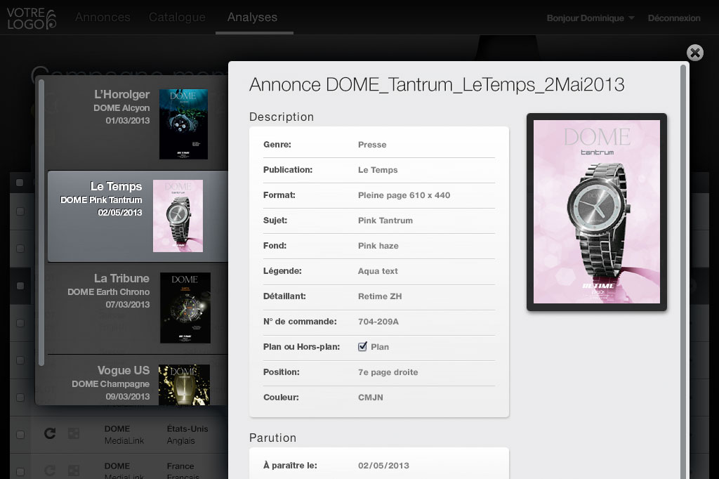 La première application de gestion et production d’annonces en ligne, dotée d’une base de données médias internationaux de près de mille titres, régulièrement mise à jour. Mais aussi un catalogue de visuels, la gestion de projets détaillants/filiales et des outils d’analyses, pour vous faciliter le quotidien.